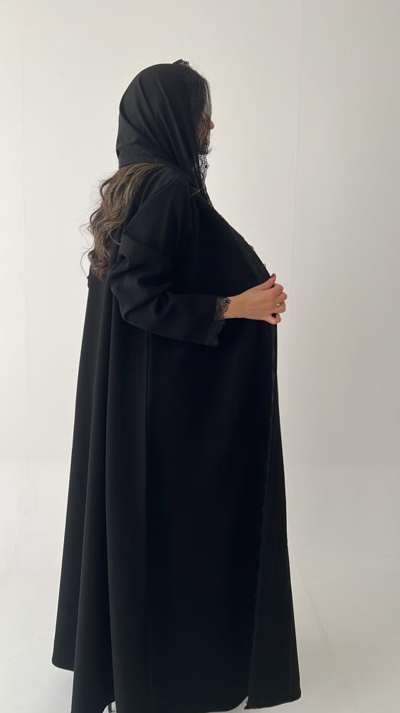 عباية قماش ( كريب سيراميك ) قصة بليزر / ربع كلوش بدانتيل في الأمام والأكمام